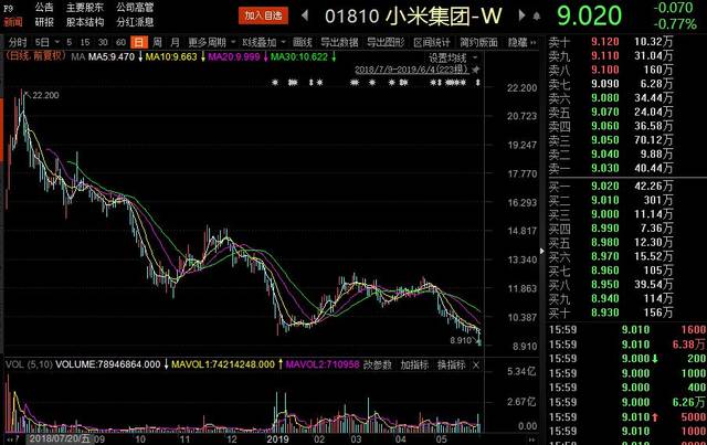 今日,小米股價繼續下跌,盤中跌破9港元,一度跌至8.91港元,最終報收9.02港元,較昨日下跌0.77%,再創上市以來新低,相比發行價跌去近47%,相比起22.2港元的最高價,跌幅接近60%。