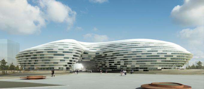 中國浙江省義烏大劇院的設計看起來像一條漂浮在河上的小船,讓人想起曾經在水域運輸貨物的中國帆船。分層玻璃“帆”提供透明度和輕盈度,同時還可作為建筑物周圍的防護罩。義烏大劇院將擁有1,600個座位的大劇院,1200個座位的中型劇院和一個可容納2000人的國際會議中心。
