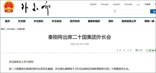 近日外交部發言人毛寧在北京時間2月28日正式宣布由于二十國集團主席國印度外長蘇杰生的邀請,外交部長秦剛即將在3月2日出席二十國集團外長會,二十國集團外長會即將是在印度新德里舉行,毛寧在會上表示現在國際形勢屬于動蕩不安的情況,全世界的經濟正在復蘇當中,需要繼續落實聯合國2030年可持續發展的議程將面臨著很大的挑戰。此次二十國集團是作為國際經濟合作主要的論壇,要對當前國際經濟和發展領域作出對應的探討,突破新的挑戰,在促進世界經濟復蘇和全球發展方面發揮著巨大的作用。現在中方愿意和其他國家共同推動20國集團外長會,其目的實行多邊主義和維護糧食以及能源安全等方面,給予加強發展合作的積極信號。