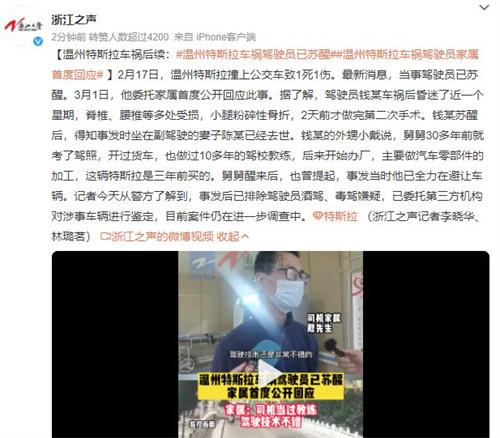 2月17號溫州發生了一起事故,一輛特斯拉不受控制,撞上公交車導致一死一傷。根據最新消息,特斯拉的駕駛員已經蘇醒在3月1號,蘇醒的特斯拉駕駛員委托自己家屬公開回應此事故。
