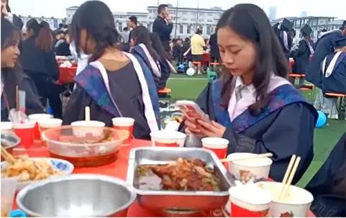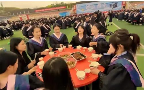 在3月20日四川南充的一名學(xué)生曬出了自己的畢業(yè)典禮,根據(jù)視頻顯示該名學(xué)生所刪除的畢業(yè)典禮和其他學(xué)校的畢業(yè)典禮有非常大的不同。一大群學(xué)生穿著畢業(yè)禮服都坐在操場(chǎng)的大圓桌上,令人不可思議的是,餐桌上竟然還擺放著豐富的菜品不知道的人還以為是學(xué)生過來吃席了。