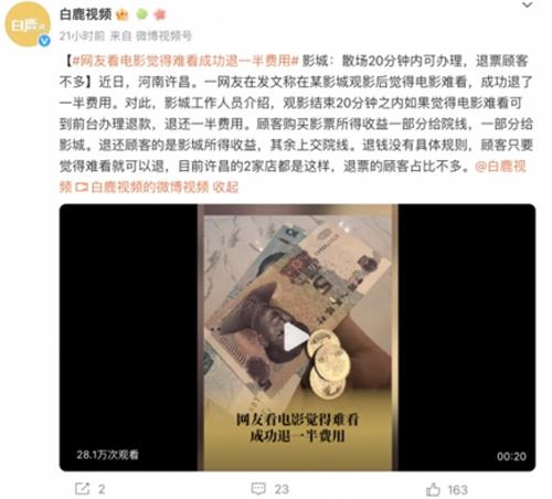 在河南許昌有一位網友表示,在胖東來影城看電影的時候,我的電影很難看,成功退了一半的費用,不少網友都感嘆,這輩子都沒享受過難看還能夠退票的這種服務, 這個影城的工作人員表示這一件事情是真的,在遠程規定20分鐘之內是可以將電影退票的,但如果超過這個時間無法退票。