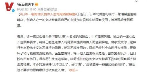 根據日本媒體4月12號報道,日本北海道札幌市有一家主打暗黑風格的咖啡館,咖啡店的女店長在上班期間根據顧客的要求,將自己的血液滴入正在調制的雞尾酒里面提供給客人使用,被發現后該名女店長遭到解雇。