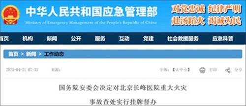北京長峰醫院4月18日發生重大火災事故。國務院安委會決定針對此事故實施查處掛牌督辦。國務院安委會將派相應的工作人員參與并幫助指導北京市調查組進行該事故的調查。國務院安委會對于此次事故的查處也提出了要求一定要嚴格依照生產安全事故報告以及調查處理的條例等相關的法律及法規進行事故的調查,迅速的將事故的原因進行查明,并且在追責時嚴肅追責到底。
