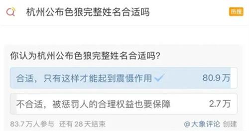 網上也多了一項關于杭州警方公布色狼完整姓名和什么的網絡投票這一項投票一共有80多萬名網有參與,有97%的投票者都贊成警方公布色狼的真實姓名,有2.7萬名網友就認為警方的這個舉動不太合適,即使他是色狼作為被懲罰人的合理權益警方也需要給出保障。有一些網友就擔心公開色狼的處罰行為以及他的真實名字會侵犯他們的隱私權,同時也會讓一些同名同姓的人慘遭誤傷。