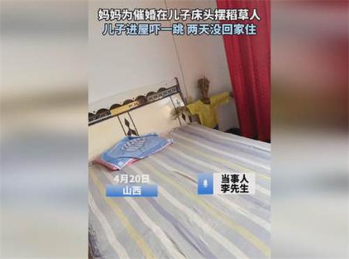 4月20日,一名來自于山東運城的網友在網上發帖曬出了自己的遭遇,據該名網友所述,他的媽媽為了催婚在他的床頭擺放了一個稻草人,當天晚上這位網友,回家的時候直接被床頭的這一幕嚇了一跳,事情發生之后,該網友的母親在網上回應稱,孩子害怕就對了,說明這樣做還是管用的。