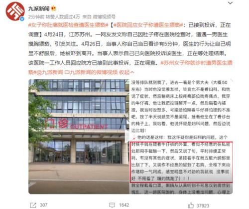 4月24日,江蘇蘇州一名網(wǎng)友發(fā)文稱,自己在醫(yī)院做檢查時遭遇一名男醫(yī)生摸胸猥褻,這名網(wǎng)友稱,自己在當天由于肚子疼便前往一家醫(yī)院做檢查,在看診的過程中,值班男醫(yī)生看似不經(jīng)意間觸碰自己的私密部位,而后又裝作不經(jīng)意碰到了自己的右胸,全部動作一氣呵成,自己在當時被醫(yī)生的動作嚇到了,于是便直接離開醫(yī)院沒有做后續(xù)的檢查。