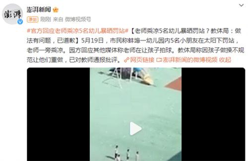近日一名老師乘涼,讓5名兒童在陽光下暴曬罰站的行為,經過報告之后被教體局懲罰,目前已經道歉。這則新聞是發生在蚌埠市一幼兒園中,據相關報道是在5月19日的某一幼兒園內,有5名小朋友被罰站在露天廣場當中,而老師卻在旁邊乘涼,色色視頻在曝光之后也引起了公眾的譴責,隨后不久,教育部門和園方相繼發表了回應。