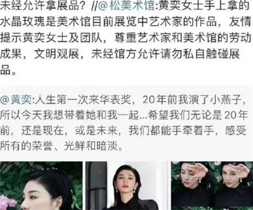 演員黃奕是在幾天前在松美術館拍攝一組宣傳片,拍攝的時候是拿美術館的展品,照片上傳之后,便被該美術館直接評論轉發,聲稱黃奕手上拿的水晶玫瑰是美術館正在展覽的藝術家作品,提示黃奕女士和她的團隊,要尊重美術館和藝術家的勞動成果,在美術館的評論轉發之后,黃奕隨后刪除了自己的上一條微博,并在微博中刊登了一則道歉聲明。