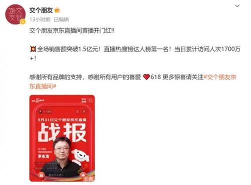 5月31日,當(dāng)天晚上羅永浩在京東開啟了自己的直播首秀,繼賣衛(wèi)星之后,羅永浩開始了自己的直播賣房之旅,在5月31日當(dāng)天,羅永浩的京東直播首秀中,當(dāng)晚銷售額突破了1.5億元,直播間的累計訪問人數(shù)達(dá)到了1700萬次,在直播過程中,羅永浩賣出了一套杭州傲旋城的精裝公寓,該公寓建筑面積為159.8平方米,每平方的售價為12800元,上架僅一分鐘就被網(wǎng)友直接搶定。