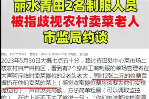 近日有麗水市民反映,有兩名執法人員怒斥出攤的賣菜老人,稱在這里賣菜就必須要用這種方法來管理,對此事很多網友都表示非常的憤怒,也引發了對此事的廣泛關注。這兩名制服人員必須要受到嚴厲的譴責,也更應該反思自己這樣不當的行為,對于農村來的人說他們想要在這里謀生是比較艱難的,這樣不僅嚴重危害了老人的自尊心,也給社會帶來了更多不良的影響,有關管理部門必須要迅速的采取行動。