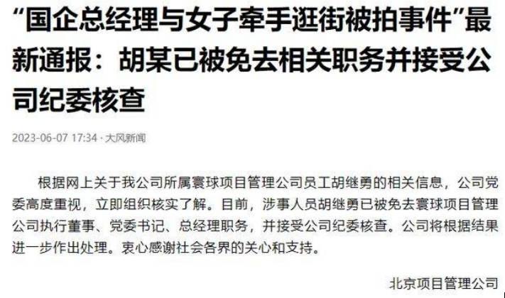 根據有關方面的消息,在6月6日,有一段中年男子和年輕女子的牽手逛街,視頻在網上流傳,受到人們廣泛關注的并不是他們親密的舉動,而是因為此視頻中的男主角是寰球工程項目公司的執(zhí)行董事胡繼勇,而該女子并不是他的妻子,由于輿論的作用和質疑性,胡繼勇已經被免去了自己的相關職位,公司也將會進一步的作出調查和處理,針對視頻中胡繼勇出軌年輕女下屬的傳聞,中國石油北京項目管理公司還未作出回應。
