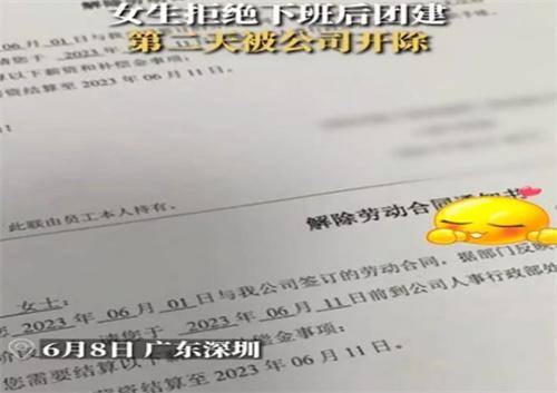 女生拒絕公司下班后團建第二天被開除,這個事件引起了廣泛熱議。周女士在深圳的某家公司工作,然后因為拒絕公司在下班之后的團建活動,在第2天就被公司開除,周女士對此表示自己的工作是單休制的,每天下午6點下班,到家的時候已經在晚上8點左右了。自己就覺得團建活動很浪費時間,所以拒絕參加。然后第2天接到了領導通知自己被開除的消息,截止目前周女士正在進行勞動仲裁,維護自己的權益。