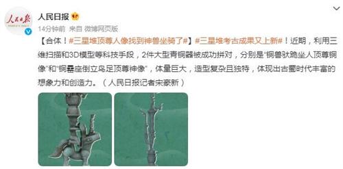 就在不久前,三星堆考古的研究團隊有了重大發現,研究團隊通過三維掃描和3D模型等各種科技手段將兩件出土于不同祭祀坑的青銅器拼對成功形成了一件“銅獸馱跪坐人頂尊銅像”,這件銅像就是上下兩部分組成,上面有一個大尊口,下面是一個長著細腰大嘴,四個花瓣狀腳趾。長耳朵尾巴蓬松的神獸。在神獸上面還馱著一個跪坐的銅人,這個銅人雙手合握在身前,頭部有方板,方板上連接的上部分的大尊口,這一件銅像的高度大約在兩米左右,重量達到了500多公斤。