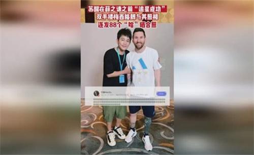 蘇醒6月14日成功追星梅西,摟著梅西胳膊與梅西合影,并且發布在了社交平臺。蘇醒是梅西的粉絲,蘇醒在梅西帶領阿根廷隊抵達北京時還發布視頻澄清,自己沒有接機,還表示有一個話題是不是“蘇醒也去接機了”,表示自己倡導理智追星,自己的歌迷也會告訴粉絲理性追星,面對自己的偶像,同樣也會理智追星。
