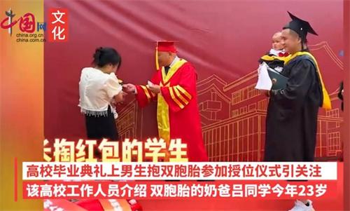 男生抱著雙胞胎寶寶參加自己的畢業(yè)典禮,為整個儀式也增添了很多亮點。畢業(yè)典禮上男生帶著寶寶出現是值得稱贊的一件事情,作為大學生可以順利的畢業(yè)是十分優(yōu)秀的,而這名同學在人生當中最重要的時刻,帶著自己的寶寶出席,也展現了他作為父親的責任感也能夠側面的看出家庭十分幸福。這樣的行為也同樣鼓舞了大家,對于學業(yè)和家庭挑戰(zhàn),是要承擔起自己的責任。