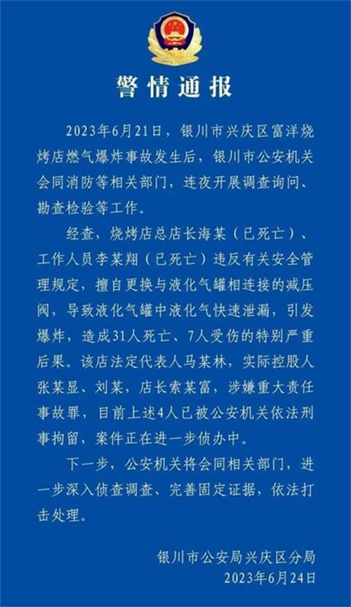 2023年6月21日,位于寧夏銀川發生了一起燒烤店燃氣爆炸事故,燒烤店燃氣爆炸事故發生之后。銀川市的相關部門立刻對該起事故進行了緊急的調查,對事故現場進行了勘驗,經過相關部門對本次爆炸事故進行調查之后。在6月24日,銀川市公安局興慶分局對外公布了本次爆炸事故的原因。