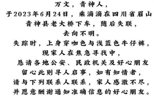 在此之前家屬就曾經發布過尋人啟事,萬某在2023年6月24號的時候搭乘網約車在青神縣老大橋下車,隨后去向不明失去了聯系,失蹤的時候穿的是淺藍色的牛仔褲,咖啡色衣服,萬某的父親說萬某名字叫做萬文,26歲一個月之前患上了抑郁癥導致情緒低落,本次失聯很可能和萬文的抑郁癥病情有關系。