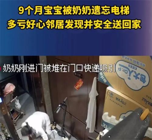 奶奶帶著9個月大的寶寶坐電梯回家,卻被堆在門口的快遞吸引了注意力,不小心將寶寶遺忘在了電梯里。鄰居發現了電梯內的異常情況立刻就按下了電梯下行按鈕,將電梯召回到了自己所在的樓層,打開電梯門之后就看到電梯內哭泣的寶寶包括嬰兒車,趕緊將孩子抱起來安撫孩子不安的情緒,之后聯系了物業人員通過查看視頻找到了寶寶的家。