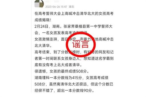 而2023年高考成績出來之后,就有網友發帖造謠這名女生高考失利成績只有500分多一點。九派新聞記者在6月29號也致電了桑植縣教育局工作人員針對于此事業作出了回應,網上傳言的508分根本是虛假信息,這名女生考了600多分,成績特別好。