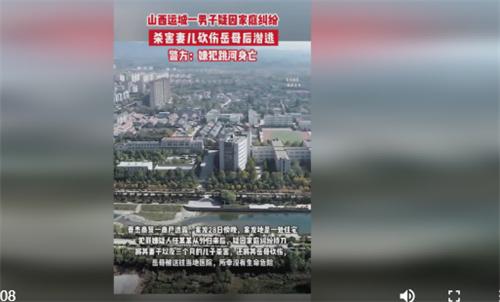 作案嫌疑人潛逃之后跳河自盡,目前遺體已經(jīng)被警方找到。極目新聞最新報(bào)道北京時(shí)間6月28號(hào),山西運(yùn)城垣曲縣發(fā)生了重大刑事案件,6月29號(hào)的時(shí)候極目新聞?dòng)浾邚漠?dāng)?shù)鼐将@悉,嫌疑人已經(jīng)跳河自盡,之前當(dāng)?shù)嘏沙鏊蚕蛎襟w證實(shí)嫌疑人在殺害自己的妻兒將自己的岳母砍傷之后潛逃。北京時(shí)間6月28號(hào)網(wǎng)上一份關(guān)于垣曲縣公安局發(fā)布的協(xié)查通告表示,在垣曲縣新城鎮(zhèn)京小宅晉杰商貿(mào)4樓北戶發(fā)生了重大的刑事案件,經(jīng)過(guò)警方偵查任某某有重大嫌疑男性28歲,身高在1米65左右中等身材,案發(fā)之后任某某駕駛一輛浙江牌照黑色哈佛的小型客車(chē)逃離現(xiàn)場(chǎng)。