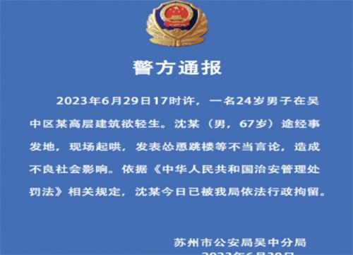 江蘇省蘇州市公安局吳中分局6月30日發布的警情通報表示,2023年6月29日17時許,一名24歲的男子在吳中區某高層建筑樓上打算輕生。沈某67歲路經事發地之后起哄,并且發表了一些慫恿跳樓等相關不正當的言論,已經造成了不良社會影響。根據中國人民共和國治安管理處罰法中的相關規定,沈某在2023年6月30日被蘇州市公安局吳中分局依法行政拘留。