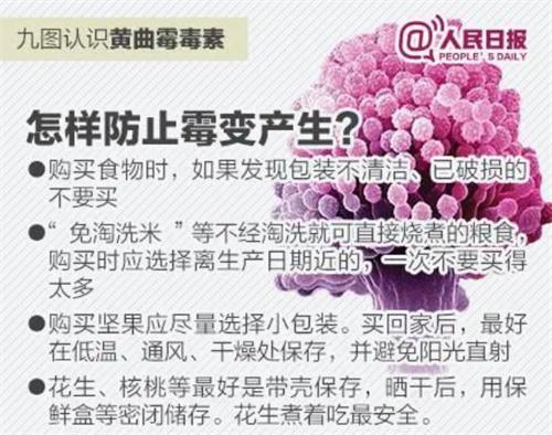 專家介紹,黃曲霉菌已經被世界衛生組織定性為一類致癌物,黃曲霉菌生長的適宜環境是26攝氏度到28攝氏度,溫度越高,黃曲霉菌的生長速度就變得越來越快,所以這種霉菌經常會出現在溫度高,而且潮濕的南方地區。除此之外,黃曲霉菌的穩定性很強,一般溫度下很難將其消滅,即便是采用100攝氏度的高溫滅菌20小時也不一定將它全部去除。