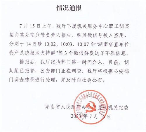 在該起事件里的涉事人,胡某某在發(fā)現(xiàn)自己的的微信,分別是在14號的10:02,11:03以及11:07,包括了湖南省資產(chǎn)單位資產(chǎn)系統(tǒng)技術(shù)支持群的三個群在內(nèi)發(fā)送了一些不雅消息,之后立刻向其處分是分管負(fù)責(zé)人進(jìn)行了報告,并隨后便向公安部門進(jìn)行了報警。