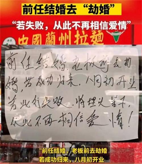 這位網(wǎng)友表示自己也是偶然間才知道這件事情的,當時自己無意間路過了這家拉面店,看到這家拉面店的門上了鎖兒,在門上還貼了一張紙條。在這張紙條里面老板稱,由于自己知道前任要結(jié)婚了,因此自己要去劫婚,劫婚如果失敗的話,回來自己依舊會繼續(xù)埋頭苦干,只是不會再去相信愛情了。網(wǎng)友將自己所看到的這一消息發(fā)布到短視頻平臺之后,立刻引來了網(wǎng)友們的深入討論。