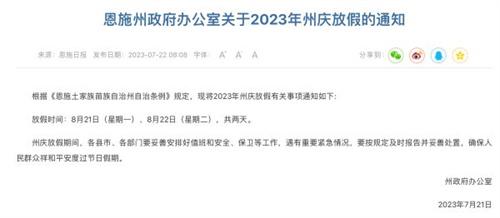 從網上公開資料中就可以了解到恩施州建立時間是1983年8月19日,湖北省僅有的一個自治州就是恩施州,2023年是恩施州建州的第40周年。州慶日期從2005年開始就設定為8月19日。不過這樣一來,有很多網友都紛紛發出了自己的疑問,為什么州慶在8月19日,放假是在8月21和8月22呢?對于這個問題恩施州政府的工作人員作出了回應,由于今年的周慶日時間是周末,根據相關規定調到了周一和周二放假加上周末兩天,所以一共放假4天可以連休。工作人員還解釋,在每年的州慶期間都會放假兩天,而且不會出現個別地方不放假的情況,整個州都是會放假的,在放假時相關部門會有人值班,與此同時州慶期間也有一些活動,也歡迎大家到恩施州游玩。
