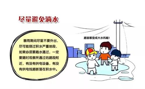 雷雨天也不要在廣告牌附近停留,大風會容易將廣告牌刮倒,一旦靠近被砸斷的電線,人體就會發生觸電的事件,也不要靠近路燈桿,交通燈等,如果遇到水漫的情況也會漏電。盡量去選擇沒有積水的路段,如果一定需要淌水時仔細的觀察附近是否有路燈,配電箱和公交站廣告燈箱等一些用電設備,確保積水內沒有任何電線進入,避免水作為導體發生觸電事故。