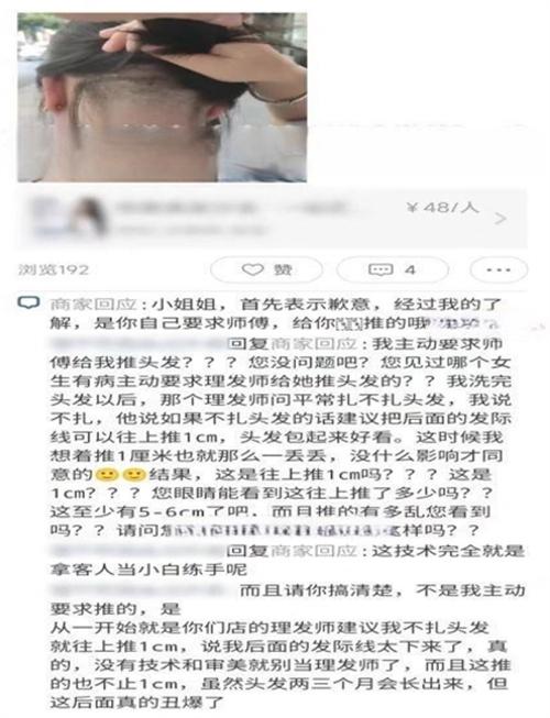 隨后記者也和這家理發店取得了聯系,但理發店里的工作人員卻表示理發師在給這位女士剃頭發的時候。這位女士是自己同意的,雙方也就這個問題各執一詞,這位女士在聽到理發店的回應之后表示,當時理發師只說了剃1cm,結果呢,卻給自己剃了多少厘米,而這個頭發剪完之后,真的是非常的丑。