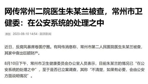 8月10日,有消息傳來(lái)稱(chēng)位于常州市的第二人民醫(yī)院醫(yī)生朱某蘭已經(jīng)被紀(jì)委監(jiān)委帶走檢查。朱某蘭在被走檢查這一消息散開(kāi)之后,也有小道消息立刻傳來(lái)稱(chēng),從朱某蘭的家里面被查到了1.5億元,其中有4000萬(wàn)的現(xiàn)金,30斤的黃金,還有20套的房子。這一消息也立刻引發(fā)了極大的社會(huì)輿論,隨后央視的記者也立刻和該起事件的知情人處取得了聯(lián)系。知情人士向記者透露,在半年之前相關(guān)部門(mén)確實(shí)就已經(jīng)將朱某蘭給進(jìn)行了留置,朱某蘭被相關(guān)部門(mén)調(diào)查,并不是在這一次的反腐新報(bào)中被發(fā)現(xiàn)的。除此之外,在提到網(wǎng)上所傳播的金額是知情人士表示這個(gè)金額和實(shí)際查處的金額有著很大的出入。