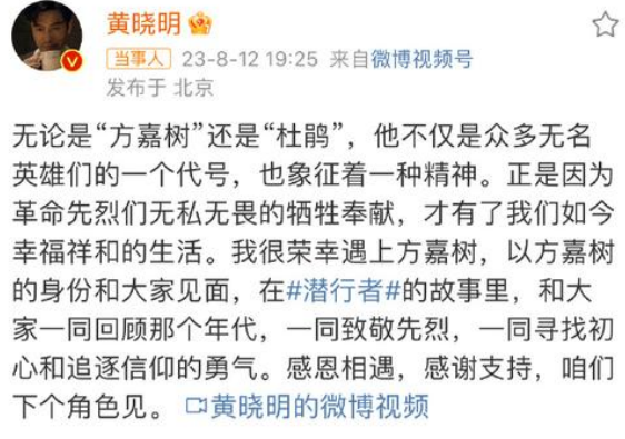 黃曉明在這篇信里面再一次講述了自己飾演方嘉樹這個角色的經歷過,從剛剛接到這個角色,對于這個角色的陌生,到怕參演不好的這個角色,一直到對于方嘉樹這個角色逐漸的理解,自己慢慢的融入到這個角色之中。再到最后和這個角色又做了最后的告別,字里行間都詮釋了黃曉明對方嘉樹這個角色的不舍之情以及敬意之情,黃曉明在參演這部電視劇時,再一次體驗到了方嘉樹的獨特魅力,方嘉樹可以為了國家,為了人民,不惜奉獻自己的偉大精神。