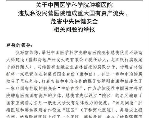 近日,我國紀委監委收到了一封舉報中國醫學科學院腫瘤醫院院長的舉報信。在這篇長達19頁的舉報信里面舉報腫瘤醫院院長郝捷涉及六大罪名,其中有一條罪名就是司開民營醫院導致國有資產流失,這封舉報信被曝光之后,雖然引發了外界的關注。隨著河北分院在今日傳來注銷登記這一消息之后,這封舉報信的內容徹底引發了外界的討論之聲。
