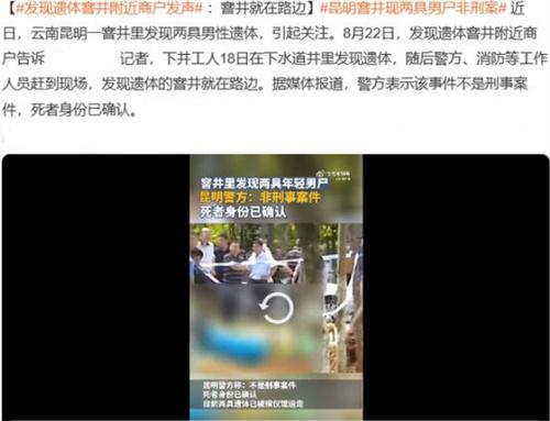 此之前云南昆明當(dāng)?shù)氐拿襟w對(duì)這起案件進(jìn)行進(jìn)行過(guò)報(bào)道,在報(bào)道中的消息顯示稱有市民近日在盤龍區(qū)金色大道和盤江東路交叉口附近的窨井里無(wú)意間發(fā)現(xiàn)了兩具男性的尸體,記者在聽(tīng)聞這一消息之后也立刻來(lái)到附近,對(duì)這附近的商戶進(jìn)行采訪,接受采訪的商戶表示,當(dāng)時(shí)有工作人員下井工作,而在下井時(shí)看到了這兩具尸體,隨后變快速報(bào)了警。