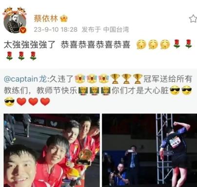在社交媒體上,蔡依林也表示 喜馬龍得到2023年乒乓球亞錦賽男單的冠軍,他的努力拼搏是我們學習的榜樣,祝愿馬龍在未來的生活和事業當中都能夠取得好成績,為中國的乒乓球事業作出更大的貢獻。