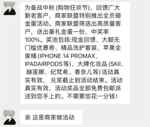 有一位網友在收到免費月餅這份快遞之后告訴記者,你打開免費月餅的快遞后,發現在里面還有一張抽獎券,在這張抽獎券里面還有著非常具有誘惑力的大獎,一部iPhone14手機,但是想要抽獎的話,則必須根據這張抽獎券上顯示的消息去對某公眾號進行關注,隨后添加公眾號的客服才能夠去領取獎勵,網友表示自己將客服的微信加完之后,客服就讓自己將自己的家庭住址以及銀行卡賬號和收款碼全部給對方,同時還告訴自己獎品寄出之后必須讓自己去指定的APP才能夠去進行查看,隨后客服又發來了一個鏈接讓自己下載,但是這位網友在看到這個鏈接之后便直接拒絕了。