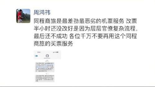 北京時間的10月7日,360董事長周鴻祎怒噴同程商旅服務(wù)差的事情,引發(fā)了網(wǎng)友們的深入討論,由于360的董事周鴻祎長在手機(jī)上使用了同程商旅,給飛機(jī)進(jìn)行改簽,但是沒有想到竟然出現(xiàn)了改簽失敗的情況,為此360董事長周鴻祎便在自己的朋友圈上,就這一事對同程商旅進(jìn)行了吐槽,在吐槽消息里面,周鴻祎稱同城雙里這家平臺的機(jī)票服務(wù)非常的差勁惡劣,在平臺上給飛機(jī)改票,半個小時后竟然還沒有給自己改好,其主要原因就是平臺的官僚流程極其的復(fù)雜,最令人氣憤的是經(jīng)過半個小時改票不僅沒有改好,竟然還沒有成功,希望大家再去買票時,千萬不要再使用同城商旅去買票了。