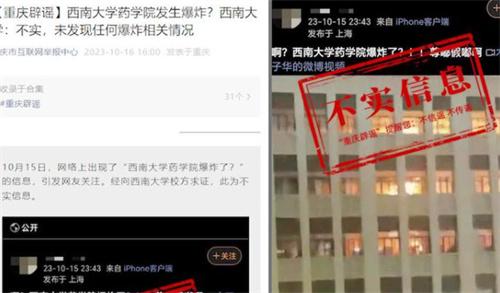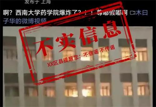 10月15日,網(wǎng)絡(luò)上出現(xiàn)西南大學(xué)藥學(xué)院爆炸的新聞,引起了人們的關(guān)注。10月16日,西南大學(xué)校方回復(fù)表示此消息為不實(shí)消息,注意到這一情況之后學(xué)校立即通知相關(guān)部門(mén)對(duì)每個(gè)樓層進(jìn)行了排查,沒(méi)有發(fā)現(xiàn)任何爆炸的相關(guān)情況。現(xiàn)在該條微博消息已經(jīng)無(wú)法正常打開(kāi)。