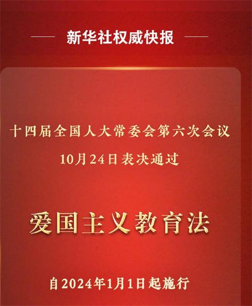 北京時(shí)間10月24日,第十四屆全國(guó)人大常委會(huì)第六次會(huì)議表決通過了《中華人民共和國(guó)愛國(guó)主義教育法》,而這個(gè)教育法的具體實(shí)施時(shí)間是從2024年的1月1號(hào)正式實(shí)行,這部教育法主要是希望加強(qiáng)愛國(guó)主義教育,同時(shí)能夠弘揚(yáng)和傳承愛國(guó)主義的精神。愛國(guó)主義教育法總共分成了5個(gè)章節(jié)和40條,具體劃分有總則,實(shí)施措施,支持保障,附責(zé),職責(zé)任務(wù)等等,也是為了能夠讓更多的青少年可以學(xué)習(xí)愛國(guó)主義精神。