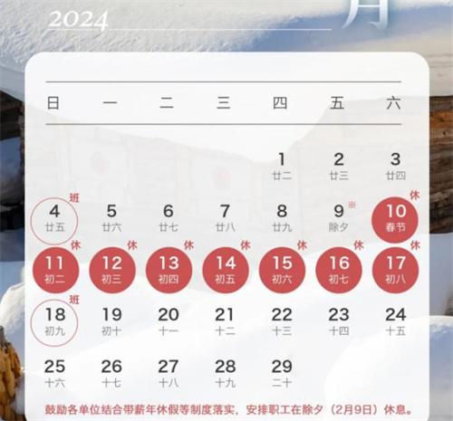 國(guó)務(wù)院辦公廳發(fā)布了2024年的節(jié)假日放假安排,其中最受關(guān)注的是2024年春節(jié)假期而是從2月10號(hào),也就是大年初一開(kāi)始,到2月17號(hào)大年初八進(jìn)行放假調(diào)休,同時(shí)鼓勵(lì)各單位交代新年。同時(shí)鼓勵(lì)各個(gè)單位將帶薪年休假制度相結(jié)合,為員工安排除夕當(dāng)天休息。按照這樣的安排,2024年春節(jié)人們將會(huì)至少有8天的假期,在聯(lián)合帶薪休假的制度,可以休息9天,可以稱(chēng)得上是新年給大家?guī)?lái)的第1份禮包。