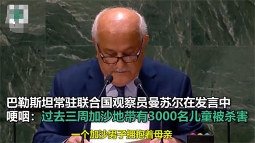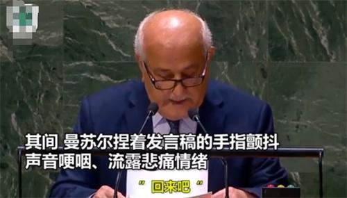 10月26日,巴勒斯坦常駐聯合國觀察員曼蘇爾作為首個發(fā)言代表,在聯合國會議上懇求會員國通過停火止戰(zhàn)的決議草案,發(fā)言的時候他拿著演講稿的雙手都在不斷的顫抖,哽咽著問道,為什么有人能夠感受到以色列人的傷痛,卻不能感受到巴勒斯坦人的傷痛,難道是我們的信仰和膚色不對嗎?