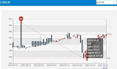 10月30號上午10:00左右記者走訪了上海浦東新區某商圈的多家珠寶品牌,了解到本次足金首飾價格突破620元每克是從周末開始的,周生生品牌首飾金價在周日的時候還曾經達到每克623元,周生生、周大福、潮宏基、六福珠寶等品牌柜臺的工作人員告訴記者,目前黃金的零售首飾價格基本上已經到達了從2023年初一直到現在的最高點。黃金價格在經歷了國慶假期期間的下跌之后,假期一結束國際國內的金價在近期總體都是呈上漲趨勢,國內的金價根據上海黃金交易所所顯示的數據國內的現貨黃金價格是從10月10號的開盤價每克446元上漲到10月27號收盤價每克475.8元。從10月10號到10月27號期間黃金的價格上漲了6.68%。