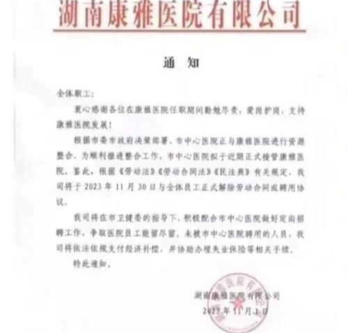 11月1日晚間,湖南益陽康雅醫院發出與全體員工解除合同的通知。益陽市委建委相關負責人在11月2日表示,這起事件正在處理當中,當前正與醫院員工進行協商。湖南益陽雅康醫院在一日晚間發布的通知,在通知中顯示益陽市中心醫院近期會正式接管雅康醫院,決定在本月30日與全體員工正式解除勞動合同或者聘用協議。雅康醫院也會積極配合市中心醫院做好定向招聘工作,并且爭取醫院員工能流進流的工作內容。