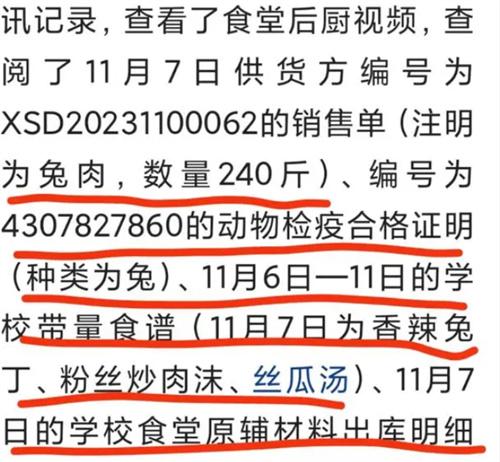 調查組對涉事學校的家長、食堂的工作人員、學生、老師進行取證,調查了食堂的后廚視頻還查閱了11月7日供貨方的銷售單標注有兔肉240斤,11月6日到11月11日的學校食譜顯示11月7日的菜品是絲瓜湯、粉絲炒肉沫、香辣兔丁。根據(jù)以上證據(jù)顯示疊加國家權威機構所出具的檢測報告,確定學生在餐盤中吃到的疑似老鼠頭的異物是兔頭的唇部。