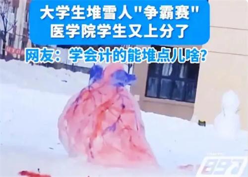 這些雪雕讓人感受到這批醫(yī)學生的活力無限,他們沒有拘泥于傳統(tǒng)的雪人或者動物造型,而是大開腦洞選擇了自己平時在課堂上最為熟悉的人體模型,這也體現(xiàn)了醫(yī)學生們對醫(yī)學知識的熱愛,這樣的一幕引起了網友的熱烈關注。有人評論稱“這些雪雕滿滿的都是知識點”,在寒冷的冬季,這種富有創(chuàng)意的雪雕作品也讓人感受到一絲暖意,這場堆雪人大賽更是彰顯了學生們異想天開的想象力。在學習和生活中,這些想象力都可以成為人們中和生活壓力的調節(jié)劑,能讓人保持心情的愉快和輕松。希望今后在這種場合種也能有更多的人發(fā)揮自己的創(chuàng)造力,把自己的想法實踐出來,或許會成為讓人印象深刻的藝術創(chuàng)作品。