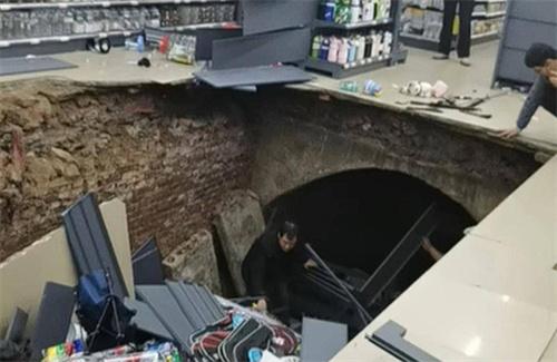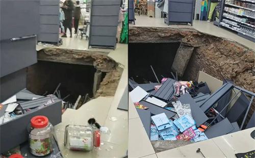 從現場拍攝的照片可以看出,附近斷裂的瓷磚、貨架和大量商品都掉入洞中,記者還注意到塌陷位置地下疑似為暗渠,兩側還砌有磚墻,頂部覆蓋預制板。11約0日事發店鋪的店長告訴記者,現在店鋪已經關門,正在配合有關部門對這件事進行調查,店長稱事發當天是剛開業第二天,當時有顧客掉進去受傷,之后被120救護車拉走,現在事件發生的原因還在進一步調查當中。