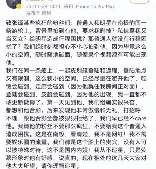 北京時間11月30日,近期娛樂圈的演員張譯由于拒絕網紅合影被罵傲慢,而這名網紅是在自己的社交平臺上面發文稱在南極偶遇到了張譯,想要跟他合照,但是被拒絕,還表示張譯十分的傲慢無禮。這名博主表示,他之所以知道張譯在船上面,是因為當時船上還有一個美籍華人告知給他。在博主知道這件事情之后,想要主動找張譯合影,并且還告知張譯自己是某個品牌的創始人。