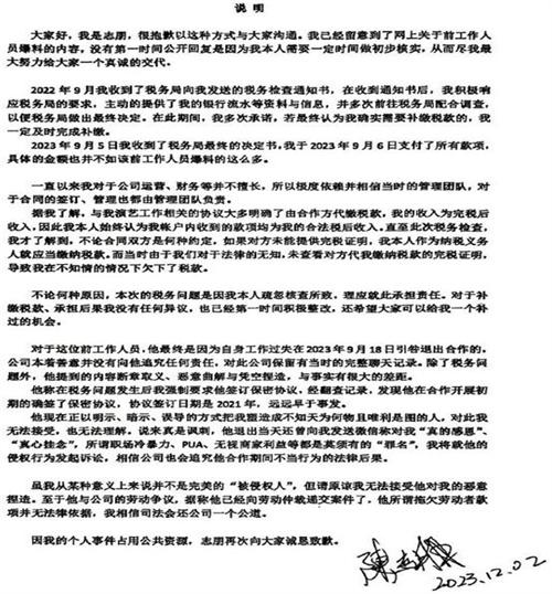 陳志朋表示由于自己年少無知,所以才會欠下一些稅款,現在已經全部進行了補交,同時對于前員工,對于他所有的指責,他一個都不認,他表示全部都是對方污蔑自己,同時將會對對方的這些話語提起訴訟,關于大家比較關心的稅務問題,他表示自己在九月份收到稅務局的檢查通知的時候,已經響應了稅務局的要求,同時按照要求將所有的稅款全部補交完畢了,對于員工之間的一個矛盾,他表示是因為員工自己工作出現了失誤,所以才會對他進行指責,但是并沒有像員工所說的那么嚴重。